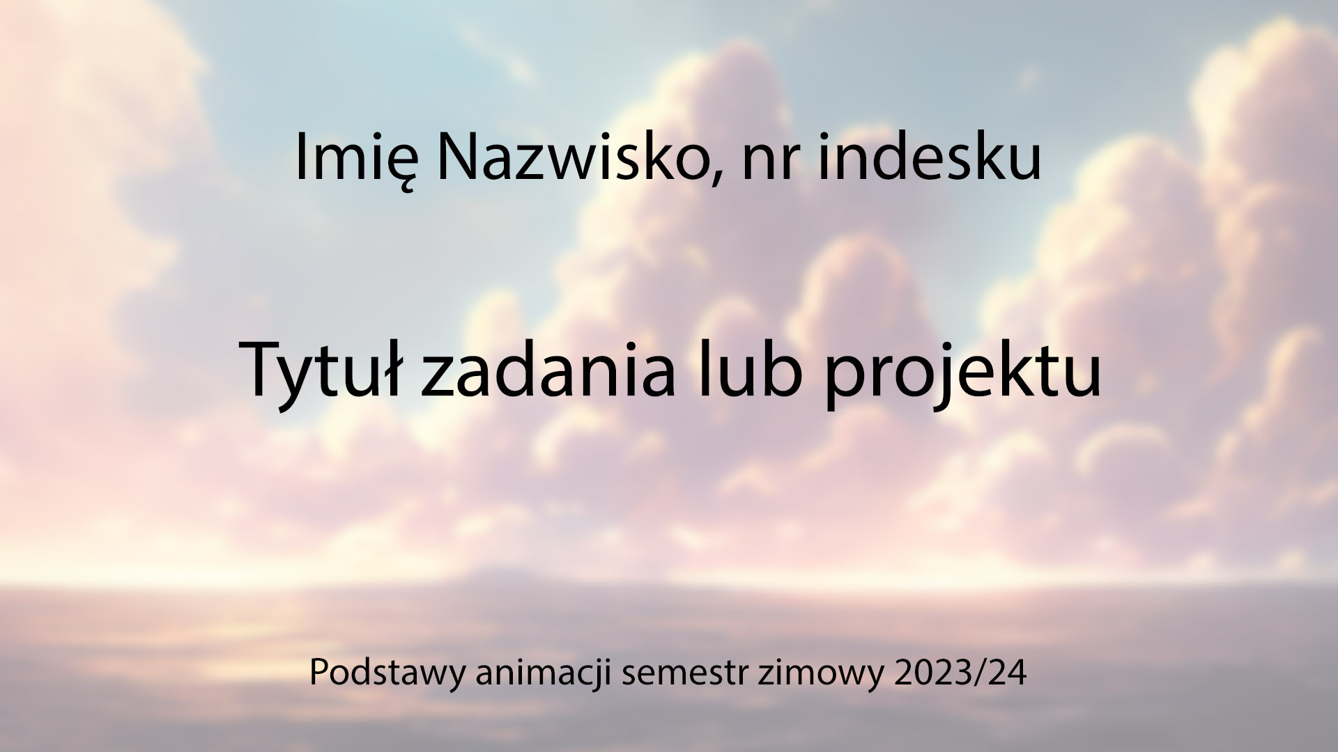 Każda praca powinna zaczynać się od planszy tytułowej zawierającej Imię i Nazwisko, nr indeksu oraz tytuł zadania lub tytuł projektu. Plansza tytułowa może być dowolnie zaprojektowana.